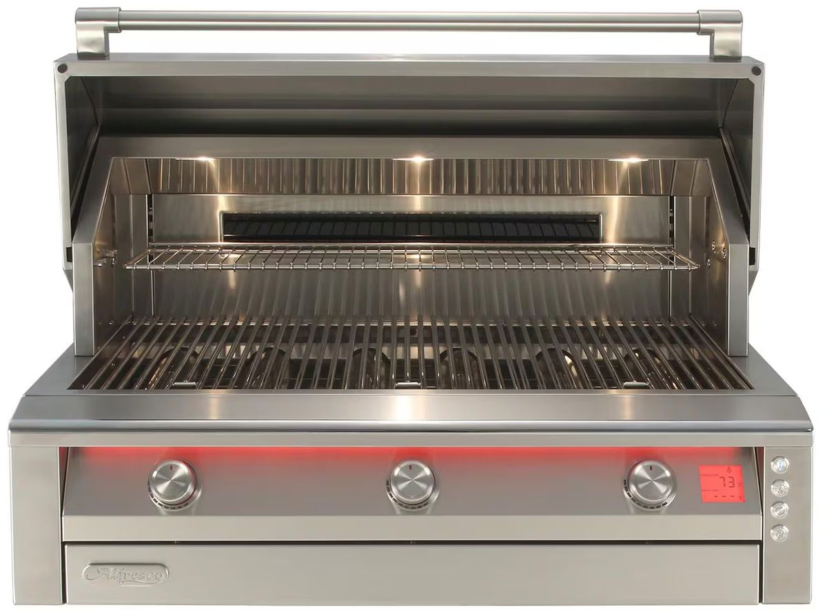 The AIPG grill puts precision and control at your fingertips with an advanced trio of smart features designed for the serious outdoor chef. The Intelli-Temp™ Smart Grilling System connects via Bluetooth® to a custom smartphone app, giving you real-time insights and allowing you to set timers, and save custom protein presets with ease. A digital backlit temperature display, located on the right corner of the control panel, provides up-to-the-second readings across all three burner zones and the wireless probe—so you always know exactly what’s happening under the hood. Completing the experience is the LumaTouch™ Control Lighting System, which illuminates each knob and the full panel with over 20 color options and 8 brightness levels, allowing you to cook in style and comfort, day or night. Notably, the knob lighting dynamically reflects burner heat intensity, providing an intuitive visual cue for precise heat management. Illuminate your grilling surface with precision using Alfresco’s Triple Halogen Grill Surface Lighting. Strategically positioned, these three high-intensity halogen lights cast a bright, even glow across the entire cooking area, ensuring you can monitor every detail of your meal with clarity. Whether you’re searing steaks or grilling vegetables, this advanced lighting system enhances visibility, allowing for perfect results every time.
