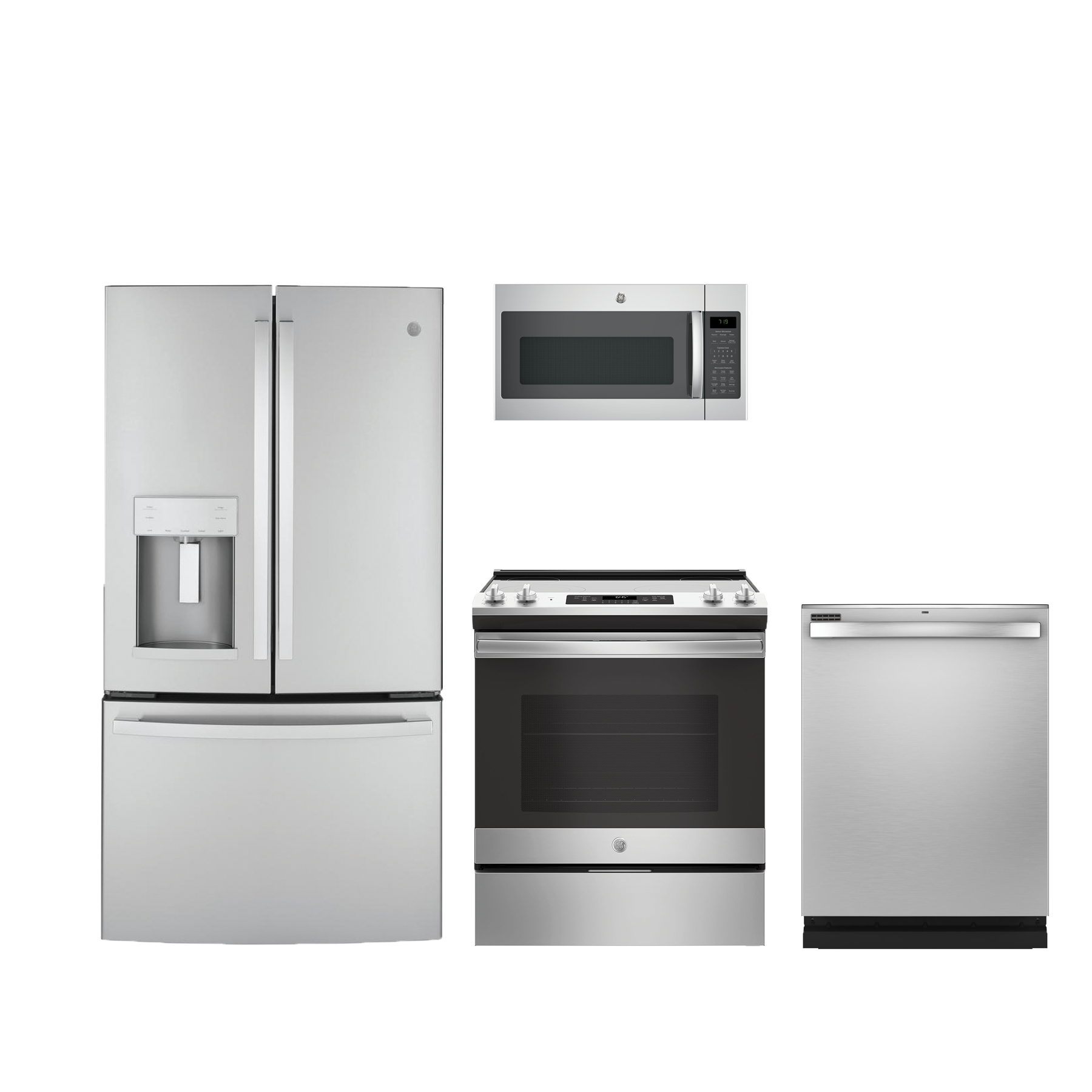 GE® 4 Piece Kitchen Package-Stainless Steel with a counter depth french door refrigerator, slide in electric range, built in dishwasher and over the range microwaveRead More